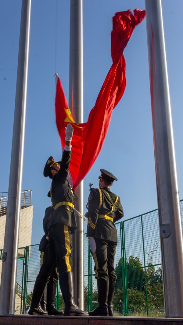 伴隨著雄壯的國歌聲,五星紅旗冉冉升起,拉開了開學典禮的序幕。