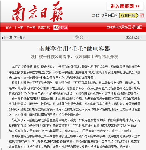 【南京日報】南郵學生用“毛毛”做電容器