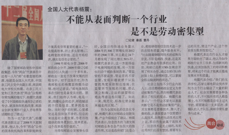 【郵政快遞報】不能從表面判斷一個行業是不是勞動密集型(采訪楊震校長)