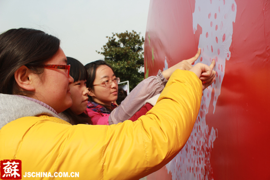 值得一提的是,南郵的“南京大屠殺死難者國家公祭日”活動也同時舉行。在“眾‘指’成城“活動區,一塊紅色的展板中間鑲嵌一幅白色的中國地圖,同學們將自己紅色的拇指印填充在白色的中國地圖上。不一會兒,白色地圖上就印滿了紅色的拇指印。“這項活動,寓意中國的年輕人不忘國恥,捍衛祖國領土完整。”張建穎老師介紹。電子科學與技術學院的學生孔令強則把拇指印按在了他的家鄉福建省的位置。“公祭活動很有必要,這不僅是對死難者的尊重,更是對后人的警示。”記者看到地圖上釣魚島、南海等處滿是紅紅的拇指印。