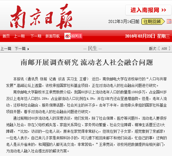 【南京日報】南郵開展調查研究 流動老人社會融合問題