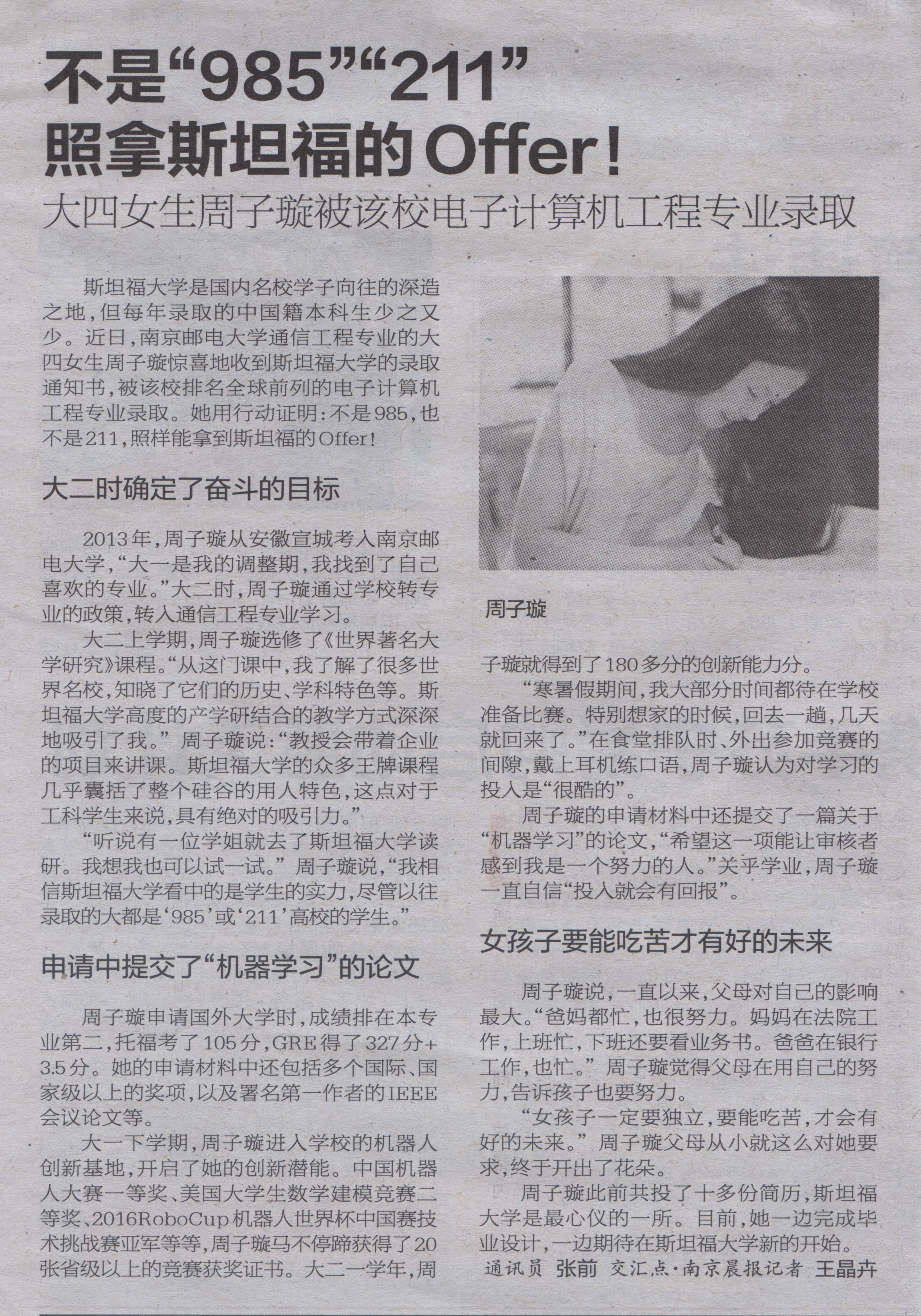 【南京晨報】不是“985”“211” 照拿斯坦福的Offer!