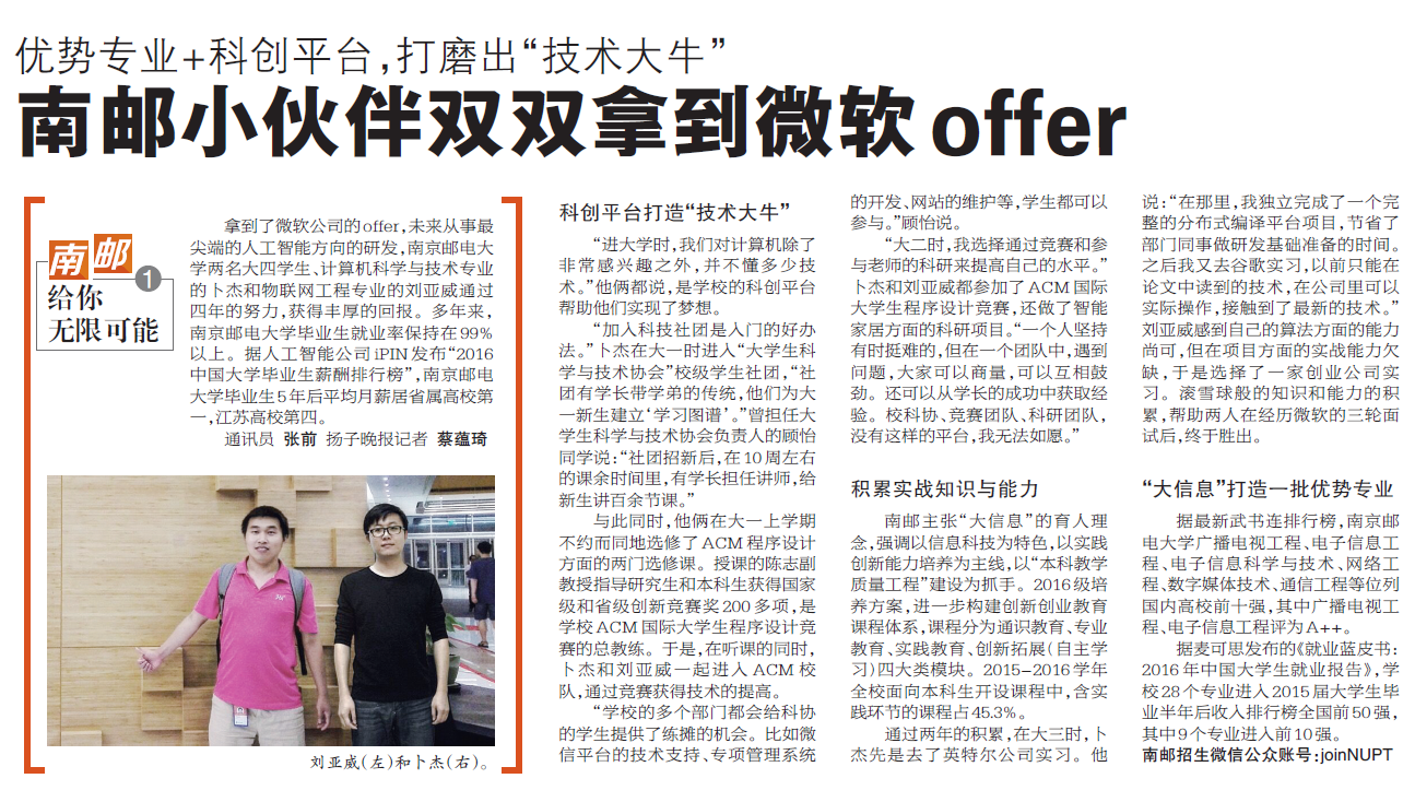 【揚子晚報】南郵小伙伴雙雙拿到微軟offer