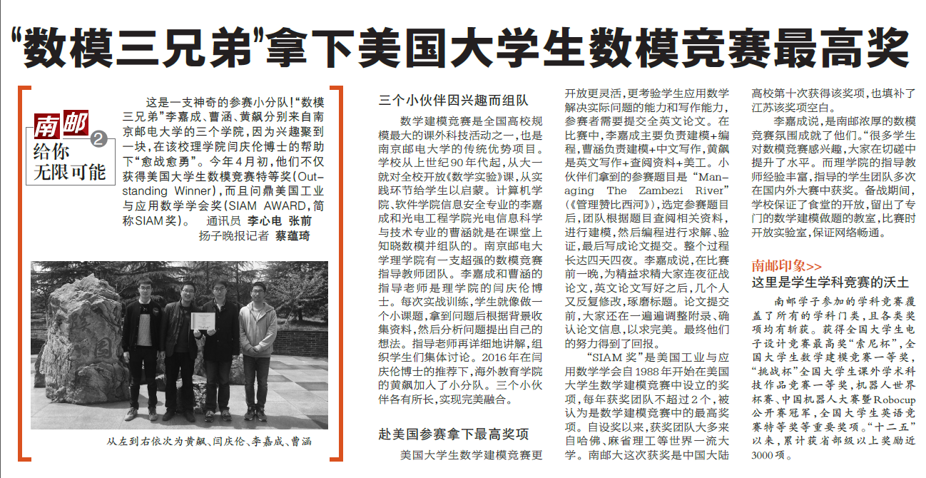 【揚子晚報】“數模三兄弟”拿下美國大學生數模競賽最高獎