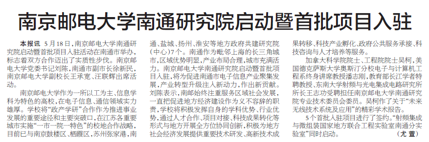 【江蘇經濟報】南京郵電大學南通研究院啟動暨首批項目入駐