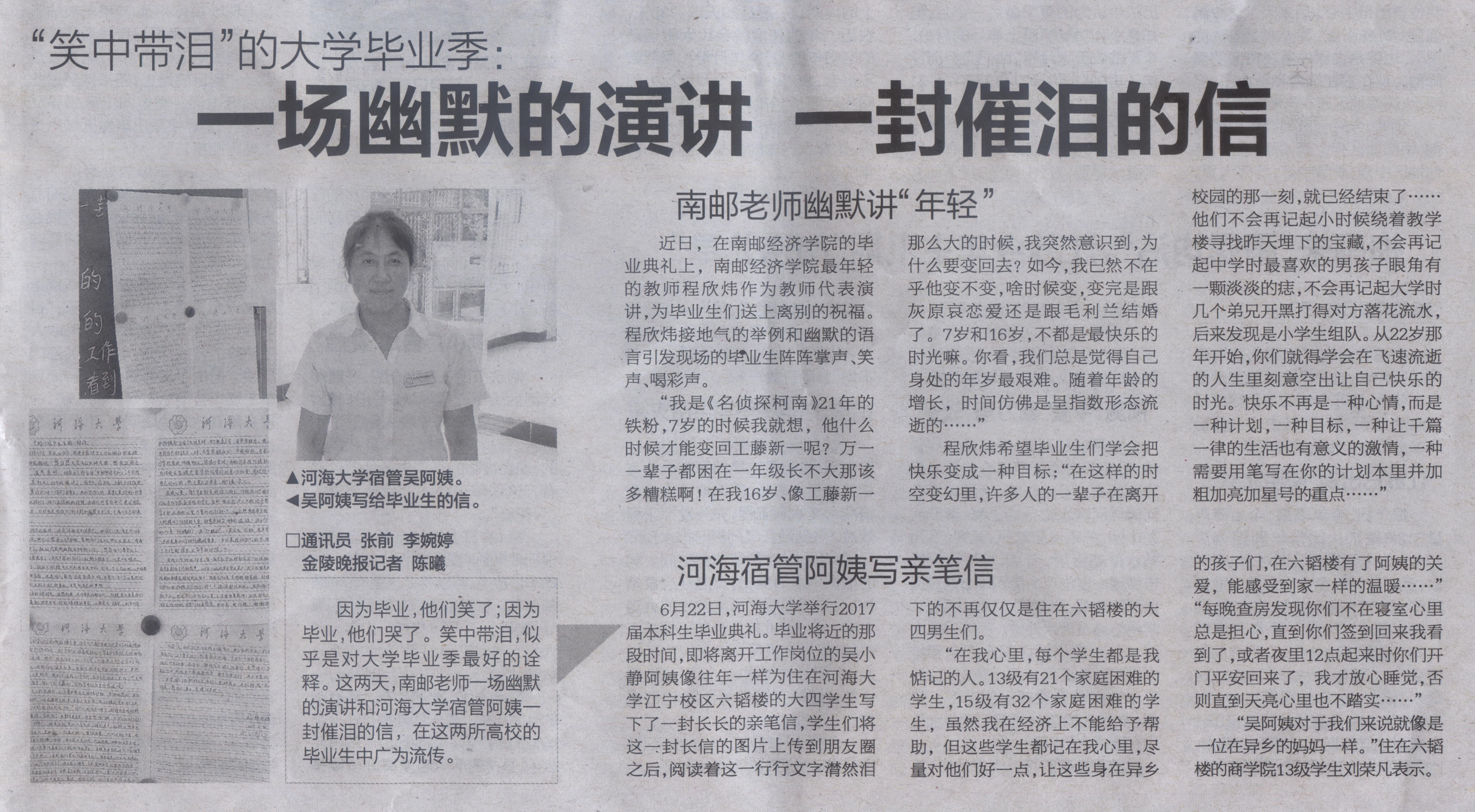 【金陵晚報】一場幽默的演講 一封催淚的信
