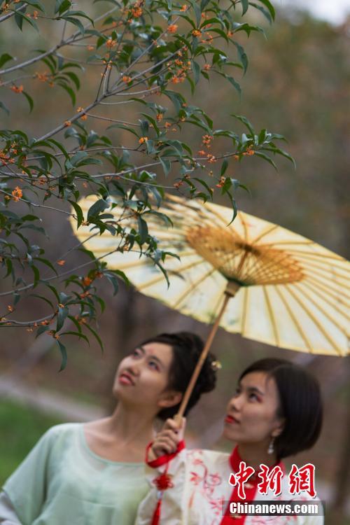 10月11日,南京郵電大學(xué)沅芷古琴社的學(xué)生身著漢服,在120年樹齡的“丹桂王”前賞花吟詩。近日,南京郵電大學(xué)仙林校區(qū)丹桂園中千株丹桂陸續(xù)開放,其淡雅的香氣沁人心脾,引得師生們徜徉期間。據(jù)介紹,園內(nèi)這棵120年樹齡的“丹桂王”名為“大葉朱砂桂”,來自“中國丹桂之鄉(xiāng)”福建省南平市浦城縣,經(jīng)過精心維護,成為了南京高校中的又一景點新名片。中新社記者 泱波 攝 |