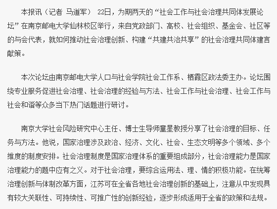 | 【南京日報】社會工作與社會治理共同體發展論壇舉行 |