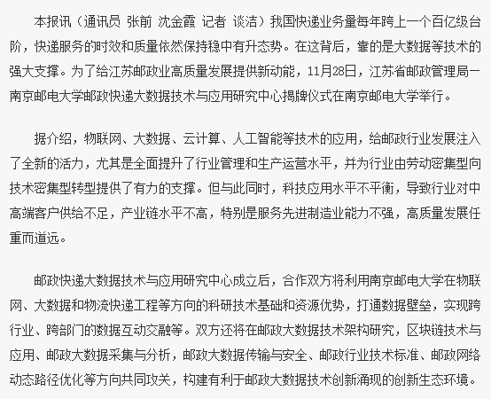 【南京日報】南郵成立郵政快遞大數據研究中心