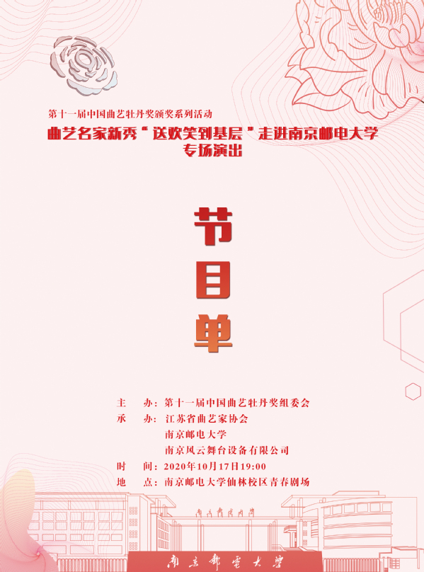 金秋金陵迎盛會,牡丹傲放迎賓朋。為了營造良好的高校文化氛圍,提高大學生人文藝術素養,曲藝名家新秀“送歡笑進基層”走進南京郵電大學專場演出活動將于2020年10月17日(周六)19:00在我校仙林校區大學生活動中心青春劇場舉行,歡迎廣大師生前來觀看。 根據校園常態化疫情防控工作要求,觀看人員均須佩戴口罩,主動配合做好體溫測量、本人健康碼入場核驗等工作后方可進場。 團委(文化藝術中心) 2020年10月14日