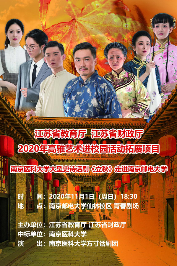 為了加強校園文化建設,全面推進新時代美育工作。2020年江蘇省高雅藝術進校園拓展項目——話劇《立秋》專場演出將于2020年11月1日(周日)18:30在南京郵電大學青春劇場演出。