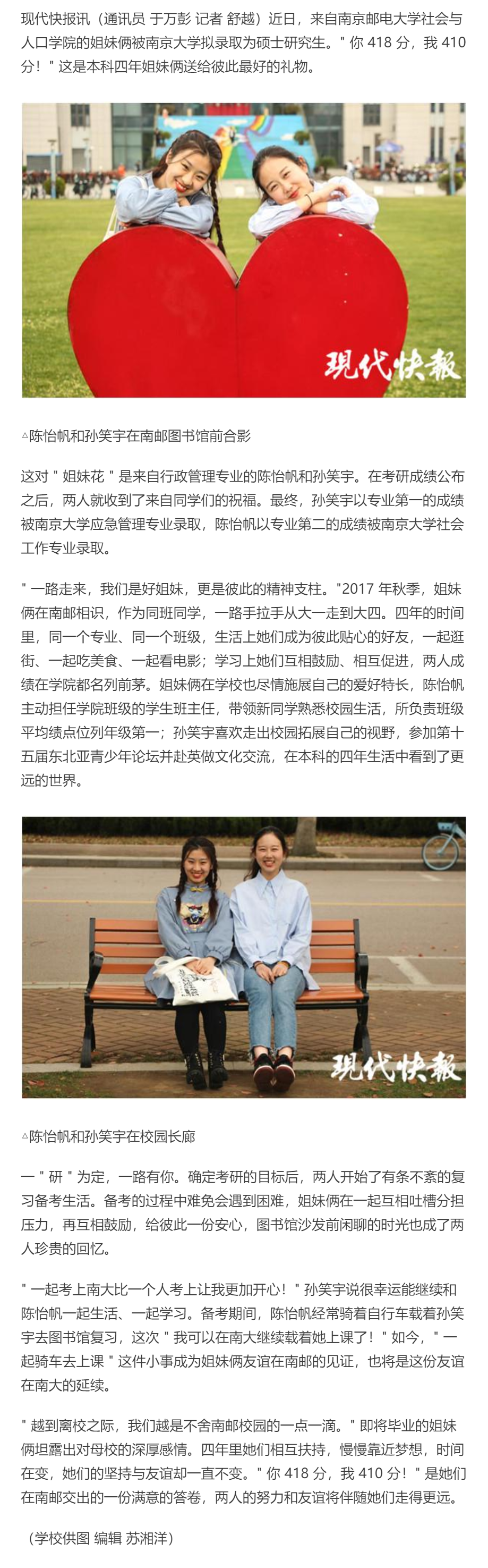 | 【現代快報全媒體】專業第一、第二!南郵姐妹花考研雙雙被名校錄取 |