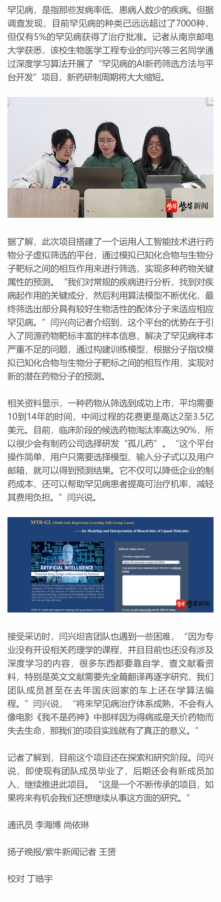 | 【揚子晚報客戶端】助力罕見病新藥篩選,南郵科研團隊用上人工智能 |