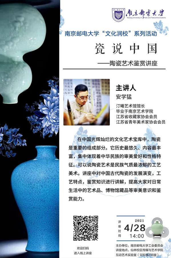 校工會將于2021年4月28日14:00,舉行“瓷說中國——陶瓷藝術鑒賞講座”。 歡迎收看。直播網址:http://play.yunxi.tv/pages/f82bee50146d4581b1421ae6860b8f17 南京郵電大學工會委員會 2021年4月19日 |