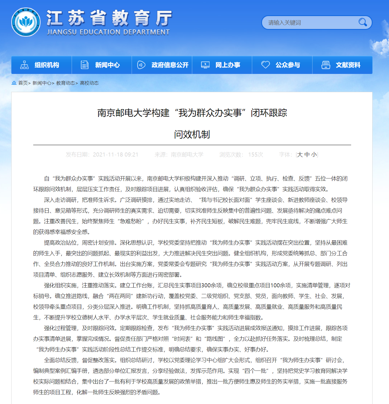 | 【省教育廳官網(wǎng)】南京郵電大學(xué)構(gòu)建“我為群眾辦實(shí)事”閉環(huán)跟蹤 問效機(jī)制 |