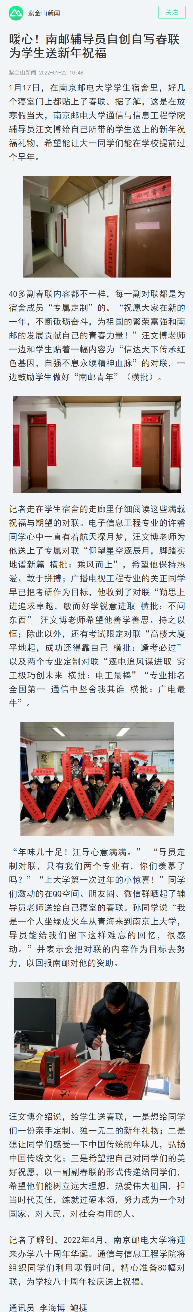 | 【南京日報客戶端】暖心!南郵輔導(dǎo)員自創(chuàng)自寫春聯(lián)為學(xué)生送新年祝福 |