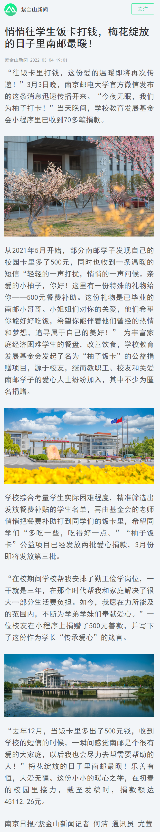 | 【南京日報客戶端】悄悄往學生飯卡打錢,梅花綻放的日子里南郵最暖! |