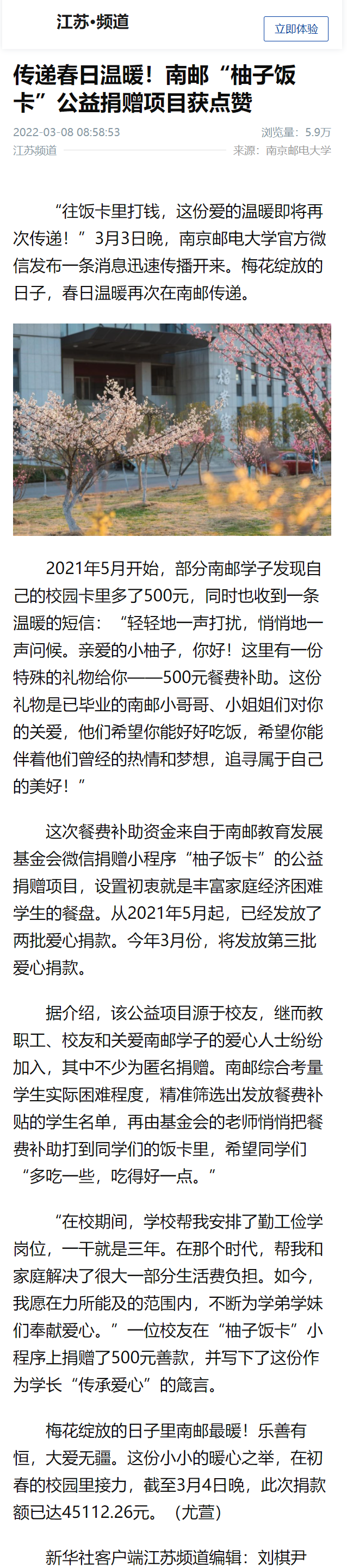 | 【新華社客戶端】傳遞春日溫暖!南郵“柚子飯卡”公益捐贈項目獲點贊 |
