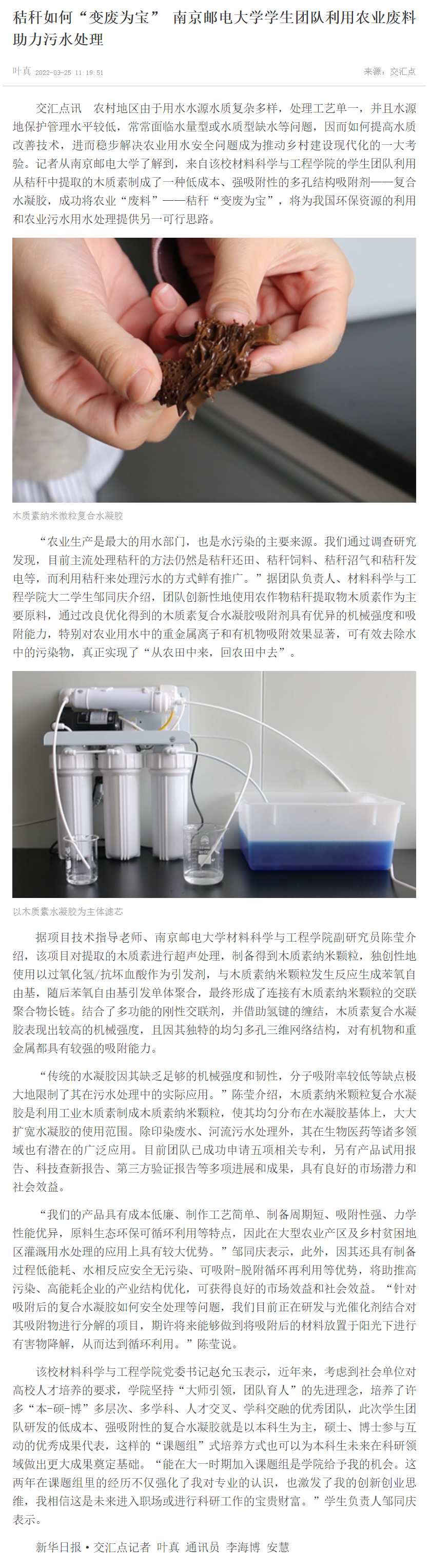 | 【新華日?qǐng)?bào)客戶端】秸稈如何“變廢為寶” 南京郵電大學(xué)學(xué)生團(tuán)隊(duì)利用農(nóng)業(yè)廢料助力污水處理 |