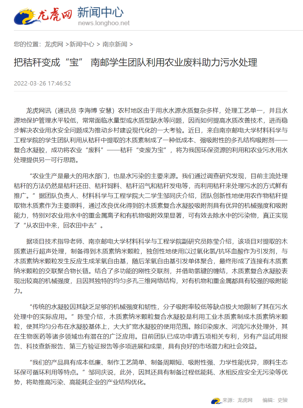 | 【龍虎網(wǎng)】把秸稈變成“寶” 南郵學(xué)生團(tuán)隊利用農(nóng)業(yè)廢料助力污水處理 |