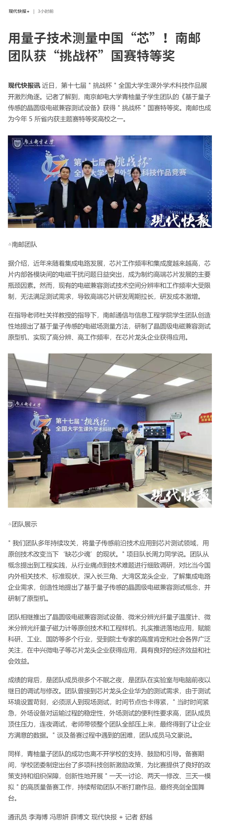 | 【現代快報全媒體】用量子技術測量中國“芯”!南郵團隊獲“挑戰杯”國賽特等獎 |