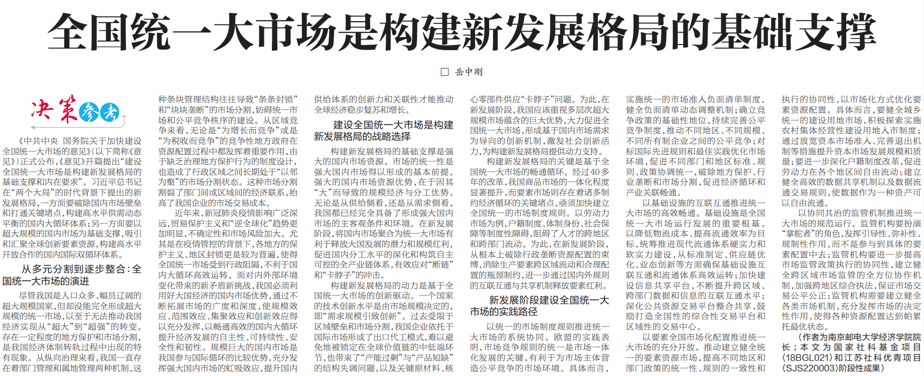 | 【新華日報】全國統一大市場是構建新發展格局的基礎支撐 |