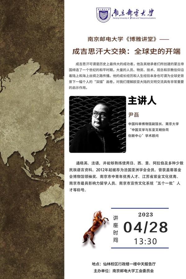 校工會將舉辦文化潤校系列活動——《博雅講堂》之《成吉思汗大交換:全球史的開端》講座。 時間:4月28日(本周五)13:30 地點:仙林校區行政樓一樓中天報告廳 歡迎全校師生前往觀聽! 南京郵電大學工會委員會 2023年4月23日 |