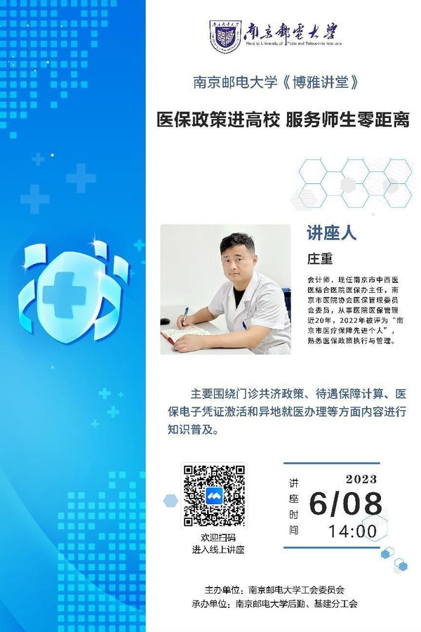 校工會將于6月8日14:00舉辦《醫保政策進高校服務 師生零距離》講座,講座為文化潤校《博雅講堂》系列活動之一。歡迎師生屆時收看。 時間:6月8日(本周四)14:00 講座開展方式:騰訊會議平臺 講座二維碼: