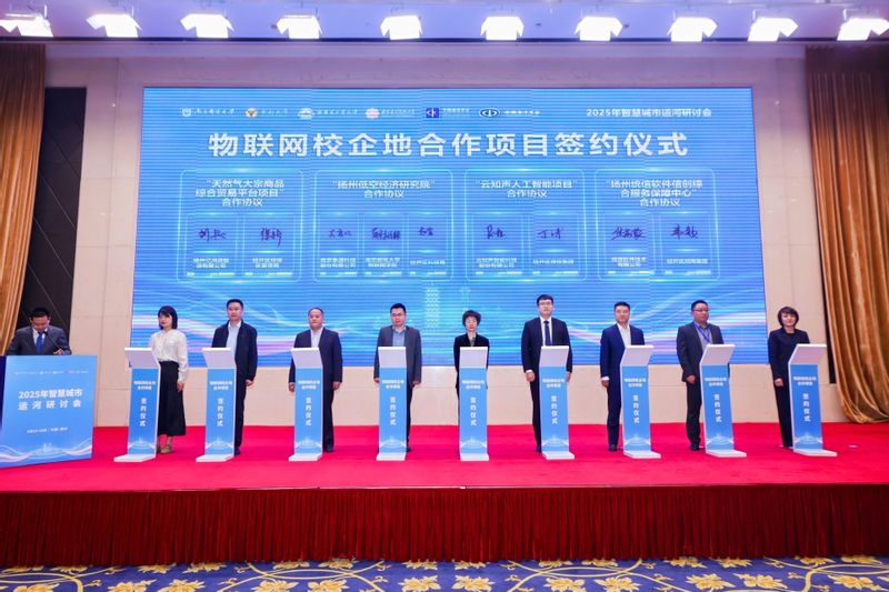 南京郵電大學校長葉美蘭教授致辭 開幕式上舉行了“物聯網校企地合作項目簽約儀式”。揚州經濟技術開發區作為揚州科技創新的核心引擎,現場簽約了9個重點項目,涵蓋人工智能、低空經濟、5G工廠、數字化管理等前沿領域。