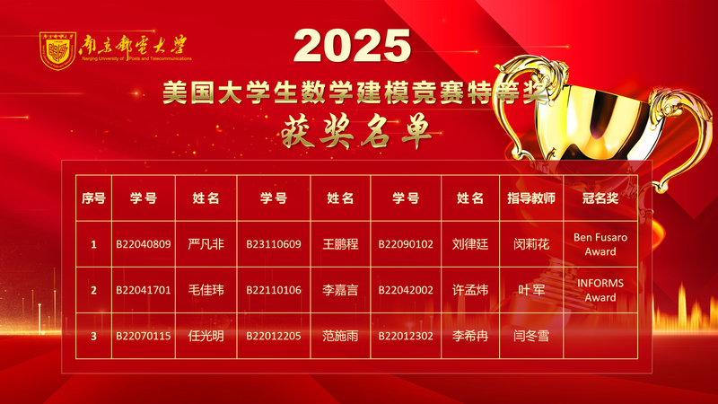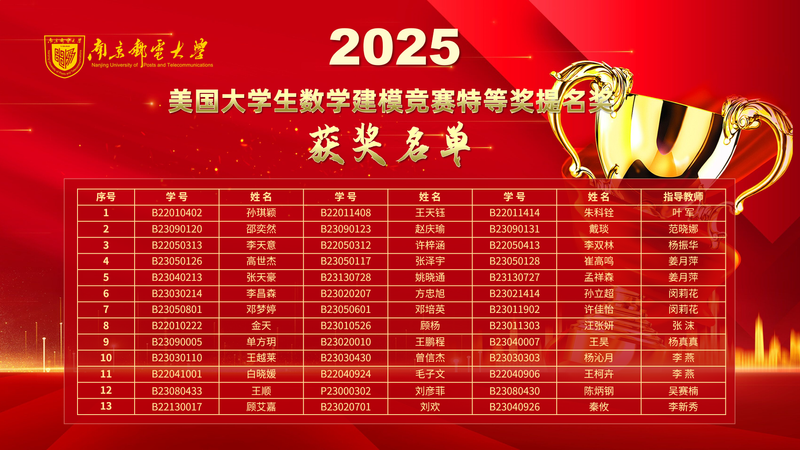 2025年美國大學生數學建模競賽和跨學科建模競賽結果近日公布,南京郵電大學獲特等獎(Outstanding Winner)3項,其中2支隊伍兼獲Ben Fusaro Award(本?富薩羅獎)和INFORMS Award,特等獎數量并列全球第一,這是繼2024年在全國大學生數學建模競賽中取得大滿貫成績后的新突破。