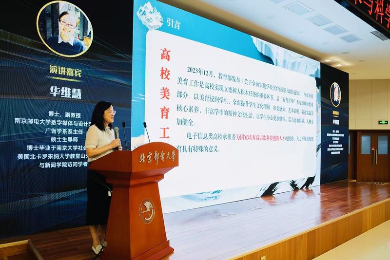 頒發證書 在論壇環節,南郵數字媒體與設計藝術學院華維慧副教授作《人工智能賦能電子信息類高校美育教育體系的創新與實踐》主旨發言,介紹南郵“紅色鑄魂、數字賦能,育一流信息人才”的美育工作思路以及“一核兩翼三階”的特色美育體系。