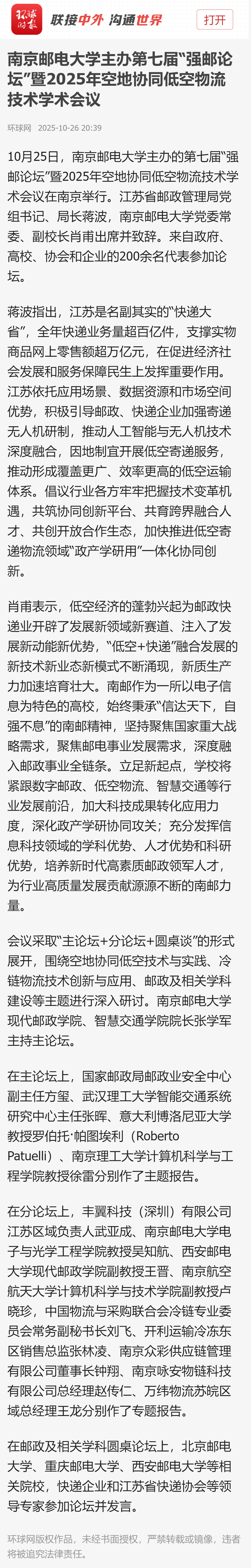 【環(huán)球網(wǎng)】南京郵電大學(xué)主辦第七屆“強郵論壇”暨2025年空地協(xié)同低空物流技術(shù)學(xué)術(shù)會議
