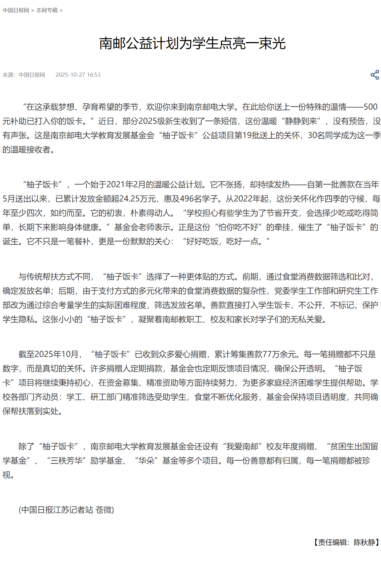 【中國日報網(wǎng)】南郵公益計劃為學生點亮一束光