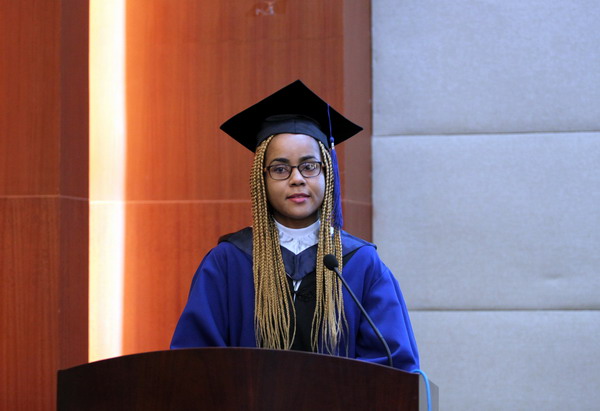Professor Zhu Weiwei, Vice dean of the School of Management, made an address as the representative of the international students’ supervisors and teachers. He recalled some memorable scenes where he discussed with his students in class and during the guided thesis writing, and hoped that they would stay true to their original objective, hold the spirit of “truth-seeking, dedication, innovation and modesty”, that never be power-oriented and profit-oriented, but instead, be simple, kind, earnest, and persistent. He also conveyed wishes that they could cherish the kinship and friendship, regard NJUPT as their mother school as well as their home in China, remember to keep in touch with each other, support each other and go hand in hand to build a splendid future.