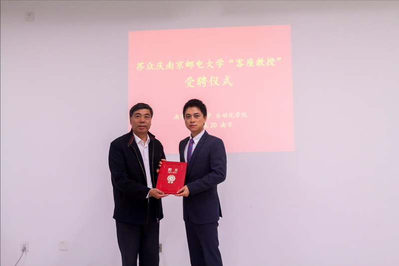 On the morning of April 20, the ceremony of hiring Prof. Su Zhongqing, the lifetime professor and deputy director of the Department of Mechanical Engineering, Hong Kong Polytechnic University as visiting professor in NJUPT was held in Conference Room 319 of the building of the School of Automation. In the ceremony, Vice President Wang Guoping issued the appointment letter of visiting professor and wore the school crest of NJUPT for Professor Su Zhongqing.
