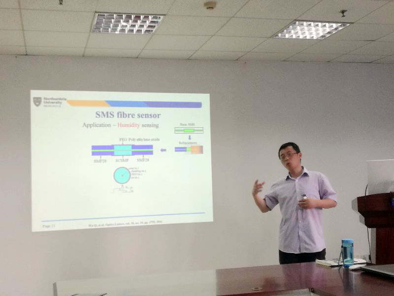 Professor Wu Qiang gave an excellent report entitled High Sensitivity Optical Fiber Sensor and its Applications. Focusing on the applications of optical fiber sensor and its Bio-chemical gas sensing, the report introduces the typical structure ofsingle mode-multimode-single mode fiber interferometer, based on which a new structure of optical fiber sensor is designed. Combined with other optical fiber components, such as fiber Bragg grating and long period grating, new all-fiber components are produced, such as refractive index sensor and filter of coarse wavelength division multiplexing communication system; they are used in new applications including biological and chemicalsensing.
