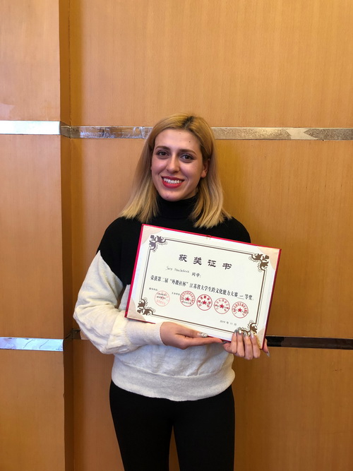 On November 20th, the second “Waijiaoshe Cup” Intercultural Communicative Competition of Jiangsu Universities was held in Yangzhou University, co-sponsored by the Jiangsu Provincial Higher Education Foreign Language Teaching Research Association, Jiangsu Provincial Translation Association, Jiangsu Foreign Languages Association and Shanghai Foreign Language Education Press. After a fierce rematch and finals, Solo Davlatova, one senior student majored in Business Administration from Tajikistan, instructed by teacher Liu Juanjuan, was awarded the first prize of the International Student Group.