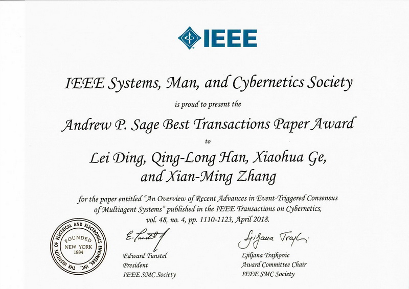 Professor Ding Lei of NJUPT wins Andrew P. Sage Best Transactions Paper Award. Recently, the 2019 IEEE Systems, Man and Cybernetics (SMC) Society International Annual Conference was held in Bari, Italy. The paper “An Overview of Recent Advances in Event-Triggered Consensus of Multiagent Systems” published by Professor Ding Lei (first author) of the Institute of Advanced Technology of NJUPT and Professor Qing-Long Han of Swinburne University of Technology, Australia and others was awarded the 2019 Andrew P. Sage Best Transactions Paper Award. The paper is the only award-winning paper of 227 papers published in the IEEE Transactions on Cybernetics (IF = 10.387) of the IEEE SMC Society in 2018.