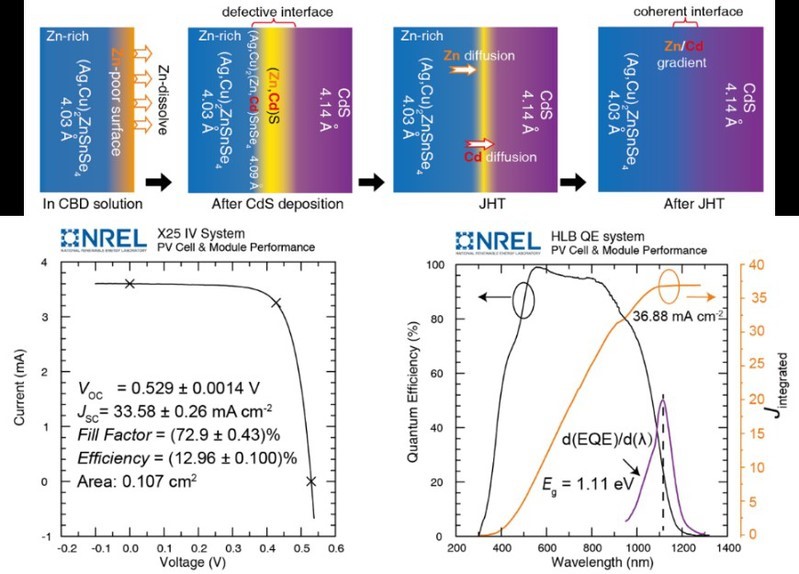 The work not only set a new world record efficiency (13%) for kesterite solar cell and broke the bottleneck of heterojunction interface recombination in it, but also revealed for the first time the construction process of heterojunction interface and the intrinsic mechanism of defect formation in kesterite solar cells. Moreover, the research revealed the chemical origin of the completely different heterojunction interfaces between kesterite and CIGS. The research results provided new ideas and strategies for further improvement of this type of cells. The work was financed by the National Key Research and Development Program of China, National Natural Science Foundation of China, and Shanghai Outstanding Academic Leaders Program.