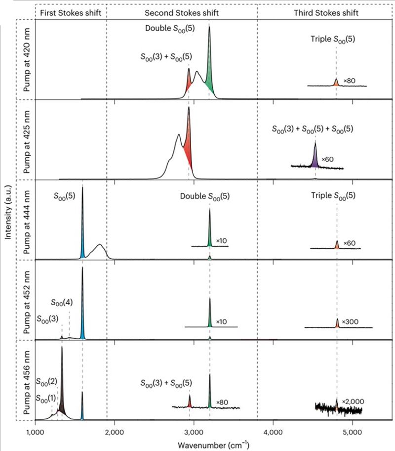 To address this challenge, the research team explored the synergistic coupling mechanism of quantum optics and molecular vibrations, proposing a theory of resonance matching between stimulated emission and Raman scattering. They developed a novel “spectral-tunable gain-induced Raman lasing” method, successfully realizing exponential amplification of Raman signals. The Raman optical devices fabricated using this method exhibit ultra-low thresholds (20–50 μJ/cm2), four orders of magnitude lower than existing mainstream Raman lasers. The Raman lasing signals demonstrate exceptionally strong energy output, with a signal-to-noise ratio exceeding 30 dB, and achieve cascaded Raman signals with a bandwidth of over 110 nm. The devices show remarkable sensitivity in explosives detection, achieving detection sensitivities above 95% and 80% for dinitrotoluene (DNT) and trinitrotoluene (TNT), respectively, at concentrations as low as one part per billion in air.